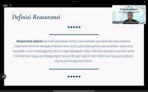 Dalam pemaparannya, Bapak Yusuf menjelaskan secara komprehensif mengenai mekanisme kerja reasuransi dan posisi strategis aktuaris dalam perusahaan asuransi. Ia menyoroti dua jalur utama dalam distribusi reasuransi, yaitu direct dan melalui broker. Jalur direct memungkinkan hubungan langsung antara perusahaan asuransi dan reasuransi tanpa perantara, sementara broker berperan penting dalam mendesain program reasuransi, menemukan kapasitas pasar, serta memfasilitasi negosiasi antara pihak-pihak terkait.