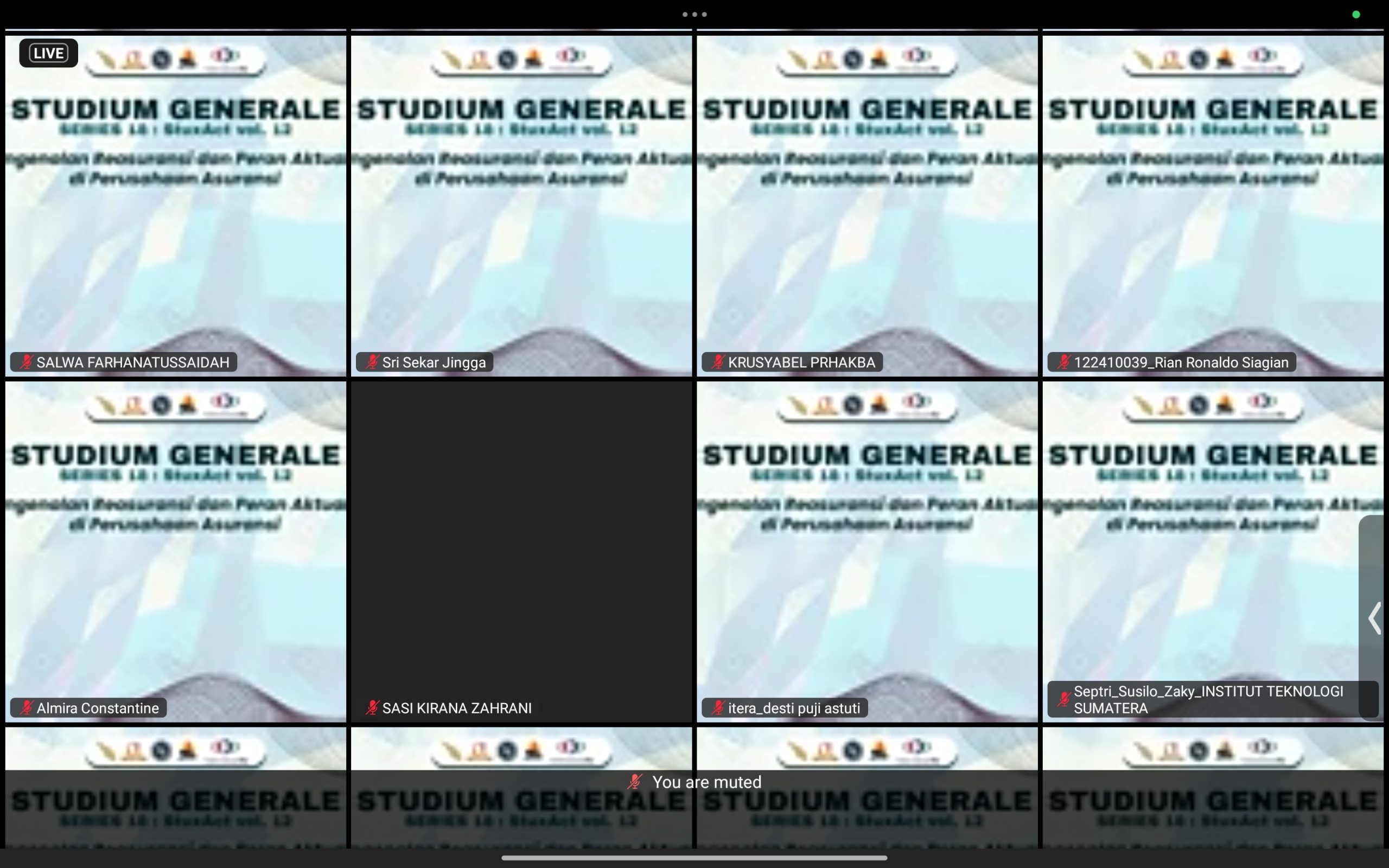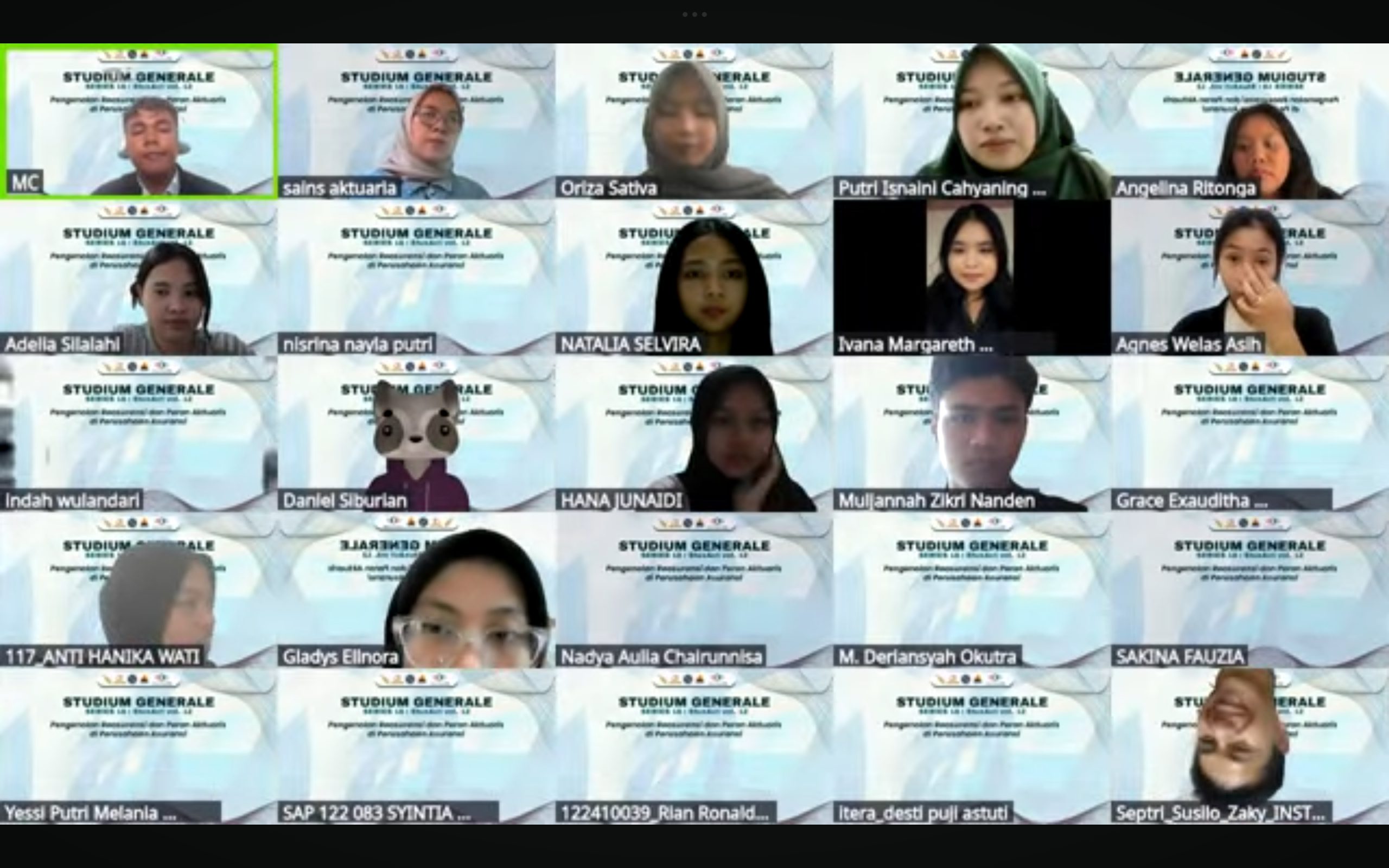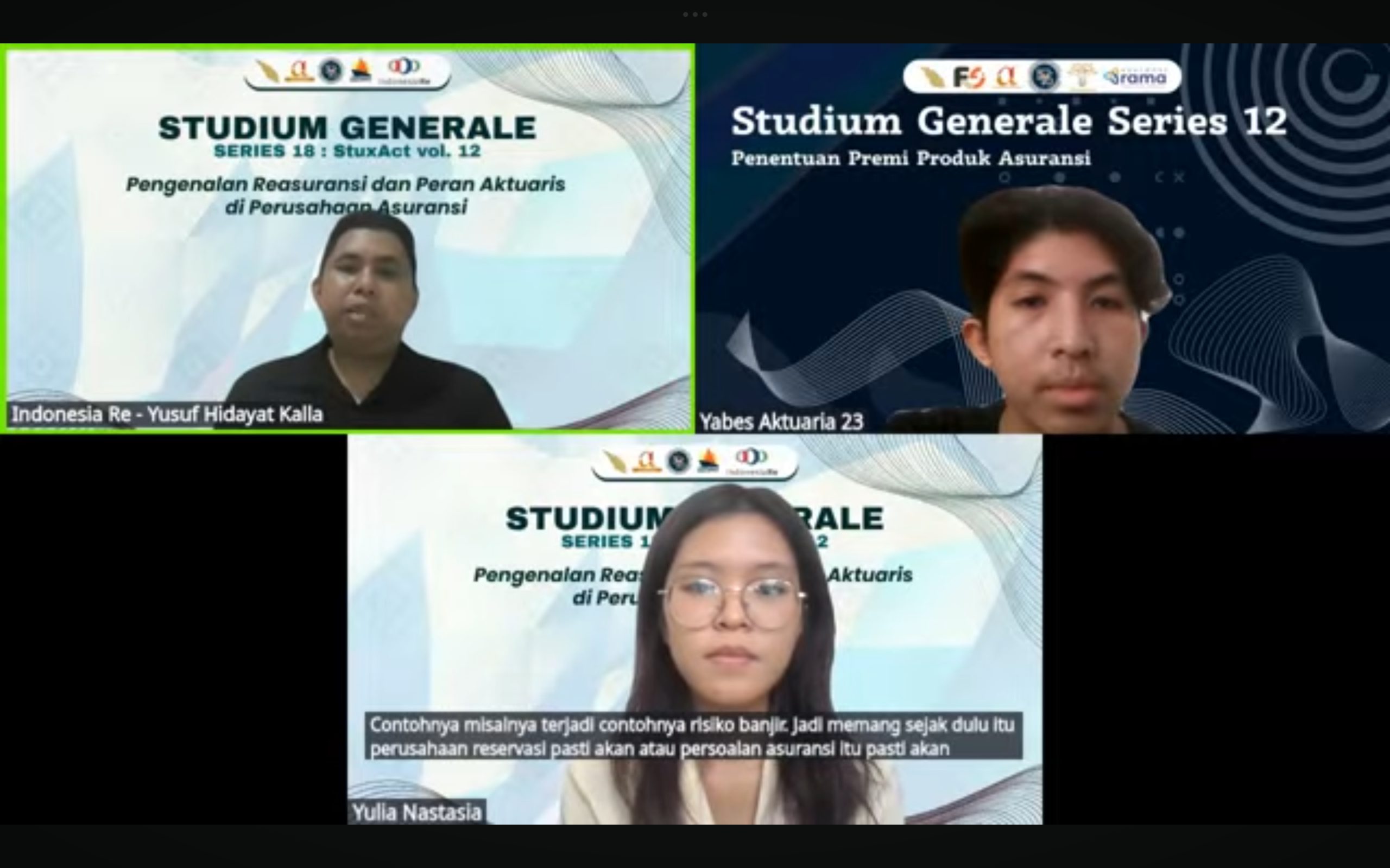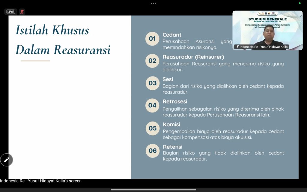 Program Studi Sains Aktuaria bersama Himpunan Mahasiswa Sains Aktuaria sukses menyelenggarakan Studium Generale (SG) Series ke-18 pada Sabtu, 19 April 2025. Kegiatan yang digelar secara daring melalui Zoom ini mengusung topik “Pengenalan Reasuransi dan Peran Aktuaris di Perusahaan Asuransi”, menghadirkan narasumber kompeten, yakni Bapak Yusuf Hidayat Kalla, M.Si., FSAI, selaku Appointed Actuary dari Indonesia Re.