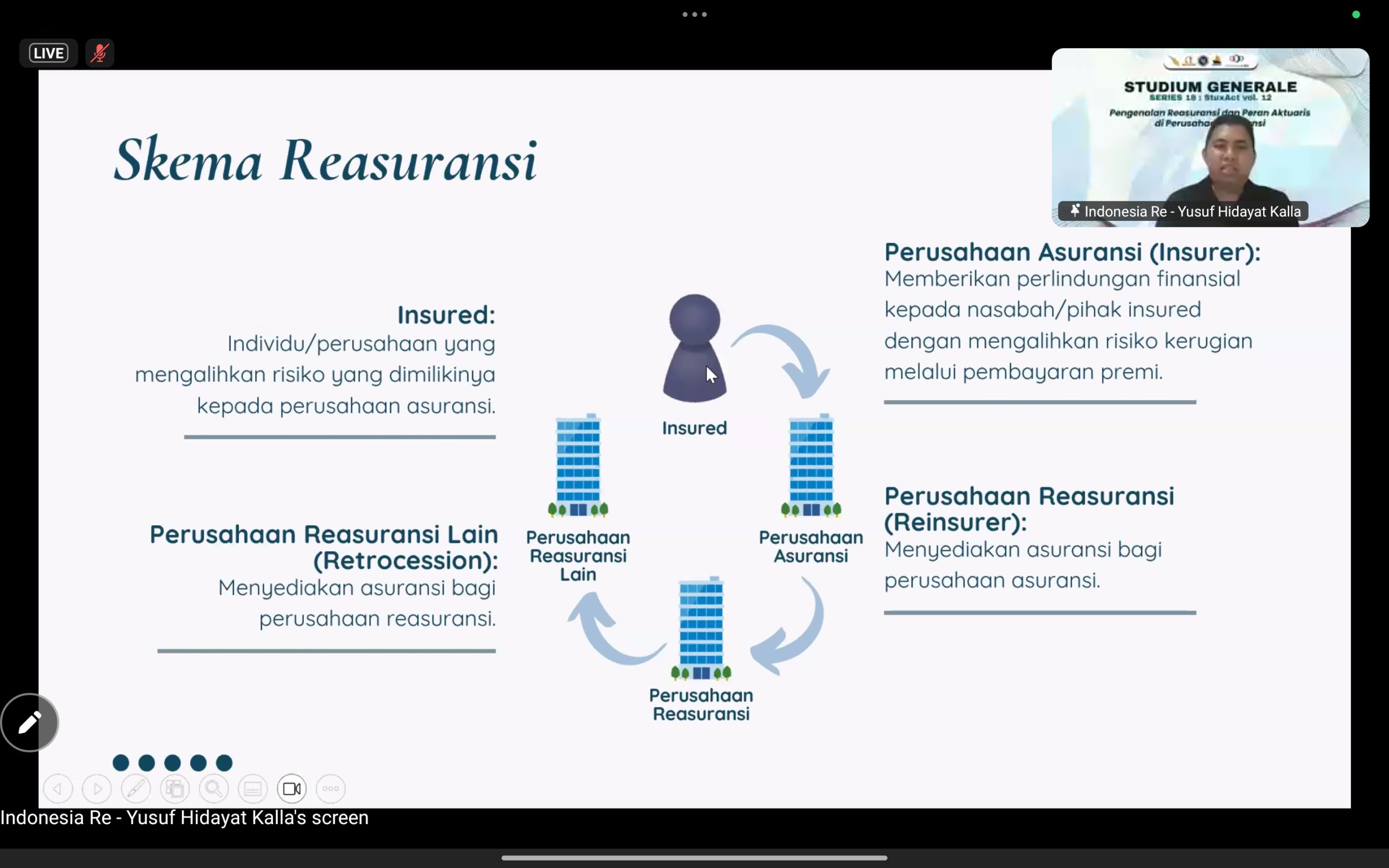 Dalam pemaparannya, Bapak Yusuf menjelaskan secara komprehensif mengenai mekanisme kerja reasuransi dan posisi strategis aktuaris dalam perusahaan asuransi. Ia menyoroti dua jalur utama dalam distribusi reasuransi, yaitu direct dan melalui broker. Jalur direct memungkinkan hubungan langsung antara perusahaan asuransi dan reasuransi tanpa perantara, sementara broker berperan penting dalam mendesain program reasuransi, menemukan kapasitas pasar, serta memfasilitasi negosiasi antara pihak-pihak terkait.