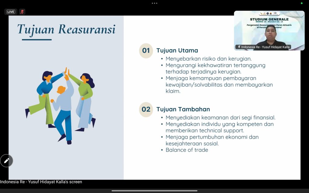 ujuan utama reasuransi, dijelaskan oleh Bapak Yusuf, adalah untuk menyebarkan risiko dan kerugian, menenangkan kekhawatiran tertanggung, serta menjaga likuiditas perusahaan asuransi dalam membayar klaim. Selain itu, reasuransi juga berperan dalam memberikan keamanan finansial, dukungan teknis, mendorong kesejahteraan sosial, mendukung pertumbuhan ekonomi, dan menjaga keseimbangan perdagangan (balance of trade).